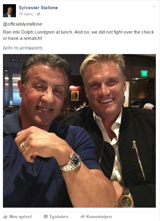 Συνάντηση με τον κινηματογραφικό του αντίπαλο, από την ταινία “Ρόκι 4”, τον Ρώσο “Ντράγκο” είχε ο Σιλβέστερ Σταλόνε, ανεβάζοντας και φωτογραφία στον επίσημο λογαριασμό του στο Facebook.