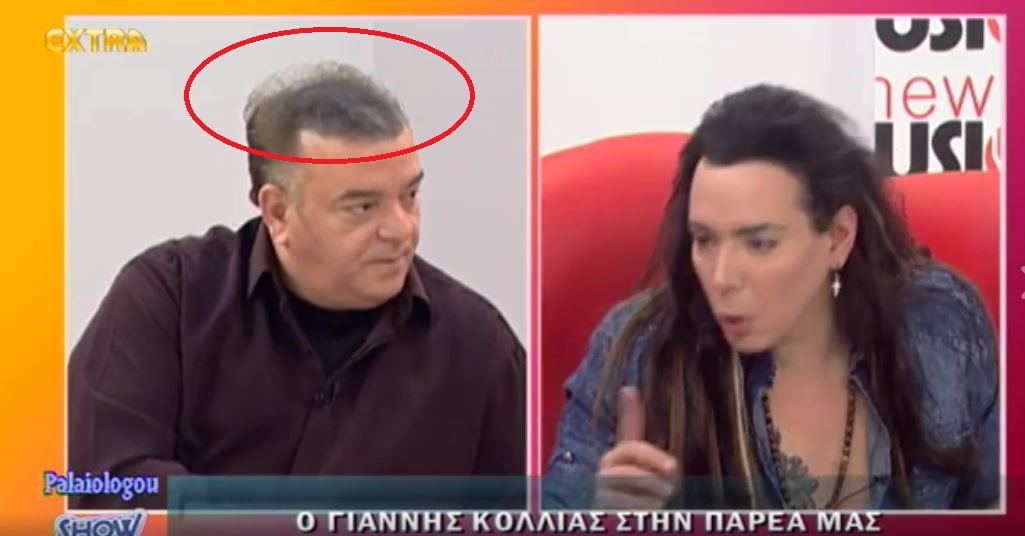 Στην εκπομπή «Palaiologou extra show» του καναλιού EXTRA CHANNEL εμφανίστηκε ο λαϊκός τραγουδιστής Γιάννης Κόλλιας για να παρουσιάσει το νέο του τραγούδι.Αυτό όμως που προκάλεσε αίσθηση στο τηλεοπτικό κοινό, ήταν ότι η κάμερα εστίασε στο… κεφάλι του τραγουδιστή, όπου εύκολα διακρίνεται ότι στο σημείο που τα μαλλιά του είναι λίγο περισσότερο αραιά, έχει χρησιμοποιήσει… σπρέι βαφής μαλλιών με χρώμα! Το αποτέλεσμα όπως είναι λογικό, τραβάει τα βλέμματα!