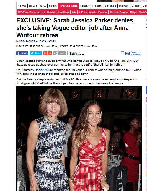 Φήμες είχαν ακουστεί ότι η Σάρα Τζέσικα Πάρκερ θα διαδεχθεί την διευθύντρια του περιοδικού Vogue Αννα Γουίντουρ όταν εκείνη συνταξιοδοτηθεί.