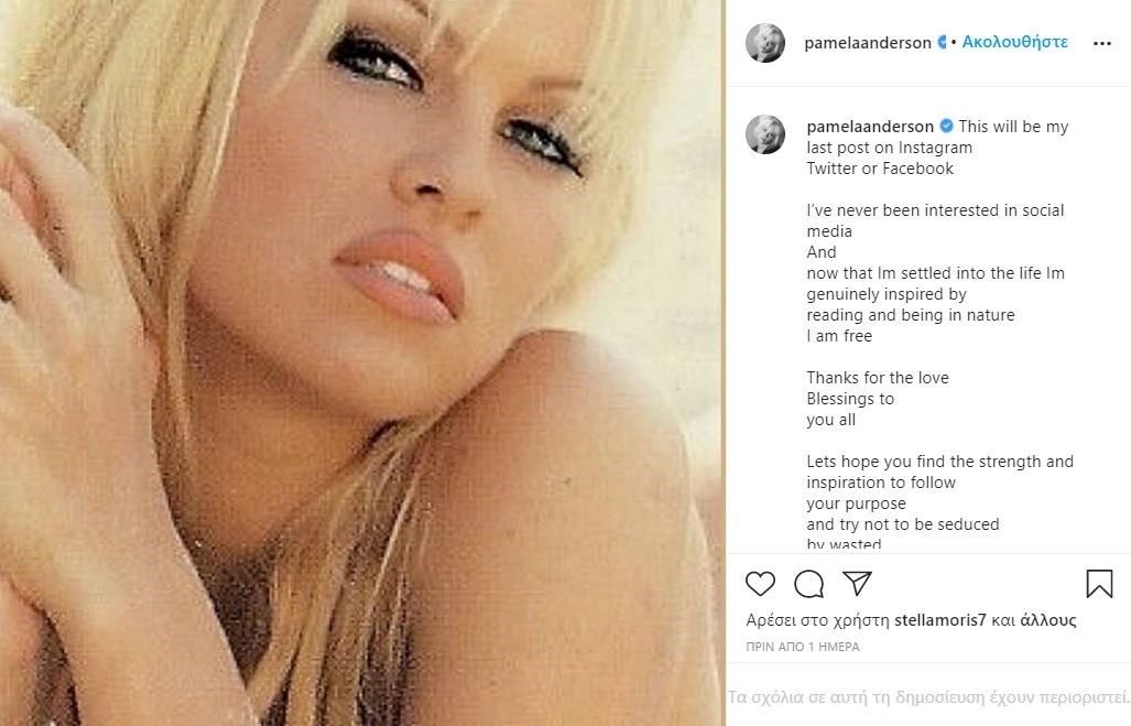 «Αυτή θα είναι η τελευταία μου ανάρτηση στο Instagram, το Twitter ή το Facebook» έγραψε η Πάμελα Άντερσον αποχαιρετώντας τους εκατομμύριου ακολούθους της στα social media τα οποία αποφάσισε να κλείσει. Έτσι, αποχαιρέτισε τους 1,2 εκατομμύρια ακόλουθούς της στο Instagram, το 1 εκατ ακολούθους της στο Twitter και τους 900.000 στο Facebook.
