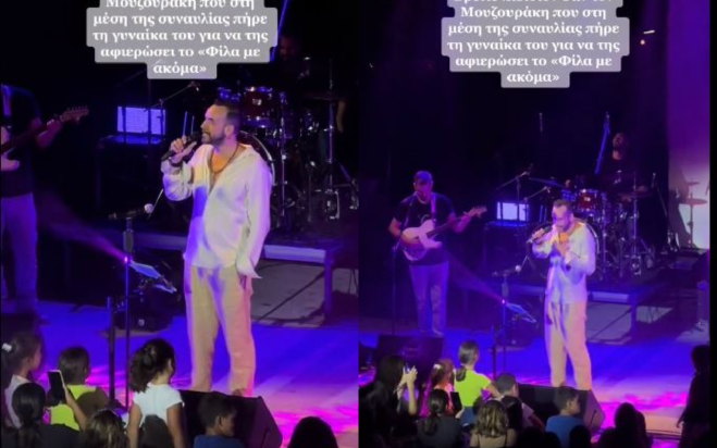 «Να βρείτε κάποιον σαν τον Μουζουράκη που στη μέση της συναυλίας πήρε την γυναίκα του τηλέφωνο για να της αφιερώσει το “φίλα με ακόμα”» γράφει η λεζάντα του βίντεο που δημοσιεύτηκε στο TikTok και δείχνει τον Πάνο Μουζουράκη να προβαίνει στην ρομαντική κίνηση πάνω στην σκηνή.