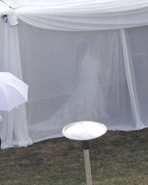 Σε αυτή τη φωτογραφία αχνοδιαφαίνεται η Drew να περπατάει ντυμένη με νυφικό, που φέρει την υπογραφή μεγάλου γαλλικού οίκου μόδας…