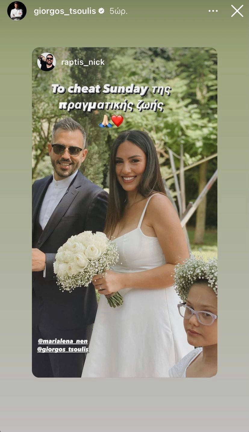 O Γιώργος Τσούλης αναδημοσίευσε στόρι των δικών του ανθρώπων που τους τίμησαν με την παρουσία τους στην μεγάλη αυτή μέρα. Πρόκειται για φωτογραφίες από την τελετή του ευτυχισμένου ζευγαριού, το οποίο μετρά πολλά χρόνια κοινής πορείας.