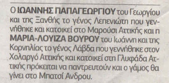 «Ο Ιωάννης Παπαγεωργίου του Γεωργίου και της Ξανθής το γένος Λεπενιώτη που γεννήθηκε και κατοικεί στο Μαρούσι Αττικής και η Μαρία-Λουίζα Βούρου του Ιωάννη και της Κορνηλίας το γένος Λάβδα που γεννήθηκε στον Χολαργό Αττικής και κατοικεί στη Γλυφάδα Αττικής πρόκειται να παντρευτούν και ο γάμος θα γίνει στο Μπατσί Άνδρου», αναφέρεται στην αναγγελία του γάμου τους που δημοσιεύτηκε στην εφημερίδα Ελεύθερος Τύπος.