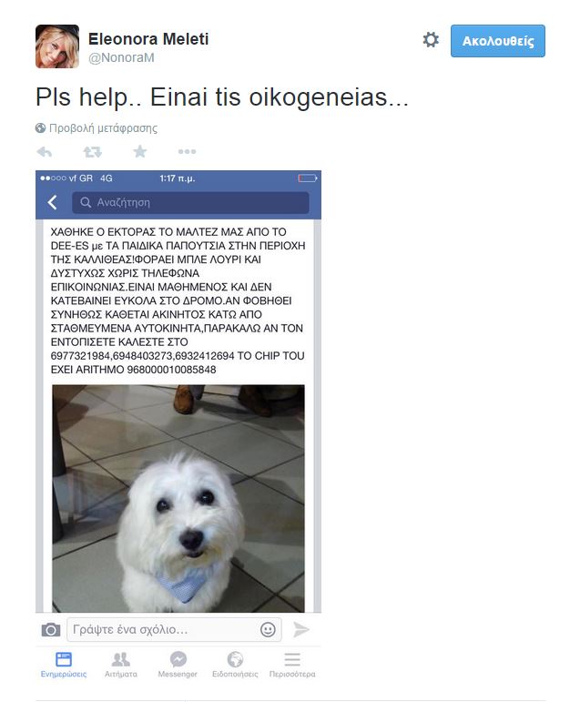 Η παρουσιάστρια Ελεονώρα Μέλετη ζητά βοήθεια μέσα από τα social media καθώς χάθηκε ο σκύλος της.