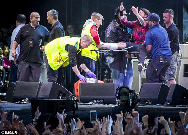 Πεσμένος στο έδαφος, αλλά κρατώντας ακόμη το μικρόφωνο στο χέρι του, ο Γκρολ είπε στο πλήθος: “Νομίζω ότι μόλις έσπασα το πόδι μου. Θα πάω στο νοσοκομείο. Θα πάω να φτιάξω το πόδι μου και μετά θα επιστρέψω”.Ο Γκρολ μεταφέρθηκε στα παρασκήνια για να του παρασχεθούν οι πρώτες βοήθειες ενώ το συγκρότημα συνέχιζε να παίζει με τον ντράμερ Τέιλορ Χόκινς να αναλαμβάνει προσωρινά τον ρόλο του τραγουδιστή.Λίγο αργότερα, ο Γκρολ επέστρεψε καθισμένος πλέον σε μία καρέκλα με το πόδι του τυλιγμένο με επιδέσμους και ολοκλήρωσε τη συναυλία.Είπε, μάλιστα, στο πλήθος: “Μπορεί να μην μπορώ να περπατήσω ή να τρέξω, αλλά ακόμη μπορώ να παίζω κιθάρα και να ουρλιάζω”.Δείτε το βίντεο από την Daily Mail:Δείτε επίσης:Γεμάτος αίματα ο Ιγκλέσιας – Το σοβαρό ατύχημα στη συναυλία – ΒΙΝΤΕΟ