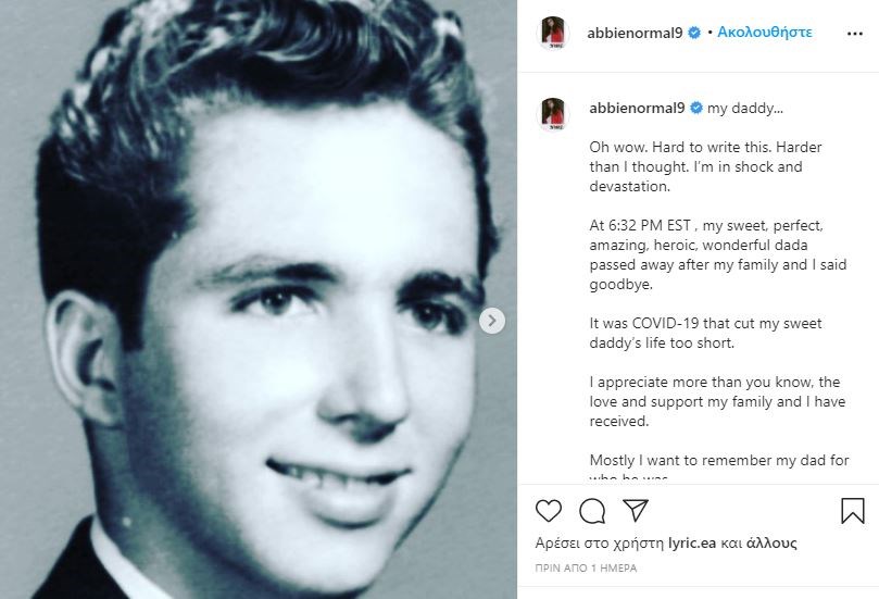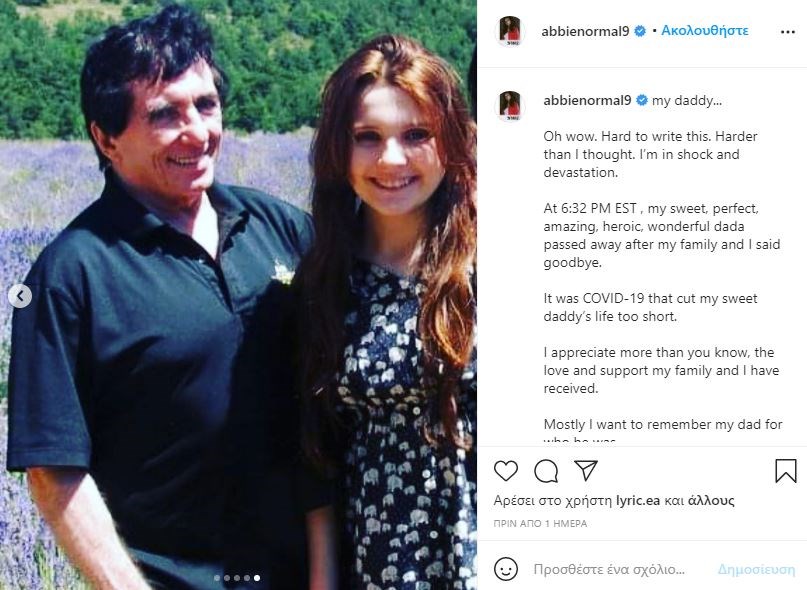 “Ο μπαμπάκας μου… Είναι δύσκολο να το γράφω αυτό. Πολύ πιο δύσκολο από όσο πίστευα. Είμαι σε σοκ και καταρρακωμένη. Στις 6.32, ο γλυκός μου, τέλειος, απίστευτος, ηρωικός, υπέροχος μπαμπάς πέθανε αφότου η οικογένειά μου και εγώ του είπαμε αντίο. Ήταν ο COVID-19 που έκοψε τόσο σύντομα το νήμα της ζωής του γλυκού μου μπαμπά”, ανέφερε στην ανάρτησή της.
