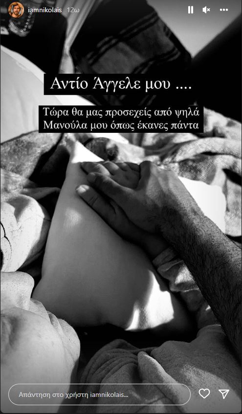 Ο Σπύρος Νικολαΐδης δημοσίευσε μία φωτογραφία στον λογαριασμό του στο Instagram στην οποία φαίνεται να κρατά το χέρι της μητέρας του. «Αντίο Άγγελέ μου…Τώρα θα με προσέχεις από ψηλά, μανούλα μου, όπως έκανες πάντα» έγραψε ο ηθοποιός.