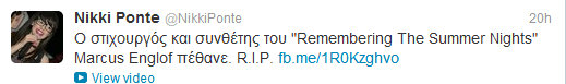 Ήταν μόλις 30 ετών! Ο Σουηδός Μarcus Englof είχε χαρίσει μεγάλες επιτυχίες στην Άννα Βίσση, την Έλενα Παπαρίζου, είχει γράψει το τραγούδι του Σαρμπέλ “Yassou Maria” για την Eurovision, καθώς επίσης και τραγούδια για την Nikki Ponte.H Nikki ήταν άλλωστε κι εκείνη που έκανε γνωστό τον θανατό του, μέσα από το twitter.Έγραψε: