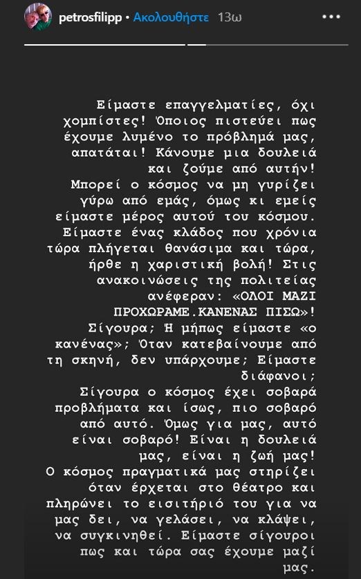 Σίγουρα ο κόσμος έχει σοβαρά προβλήματα και ίσως, πιο σοβαρό από αυτό. Όμως για μας, αυτό είναι σοβαρό! Είναι η δουλειά μας ,είναι η ζωή μας! Ο κόσμος πραγματικά μας στηρίζει όταν έρχεται στο θέατρο και πληρώνει το εισιτήριό του για να μας δει, να γελάσει, να κλάψει, να συγκινηθεί. Είμαστε σίγουροι πως και τώρα σας έχουμε μαζί μας», έγραψε χαρακτηριστικά ο Πέτρος Φιλιππίδης.