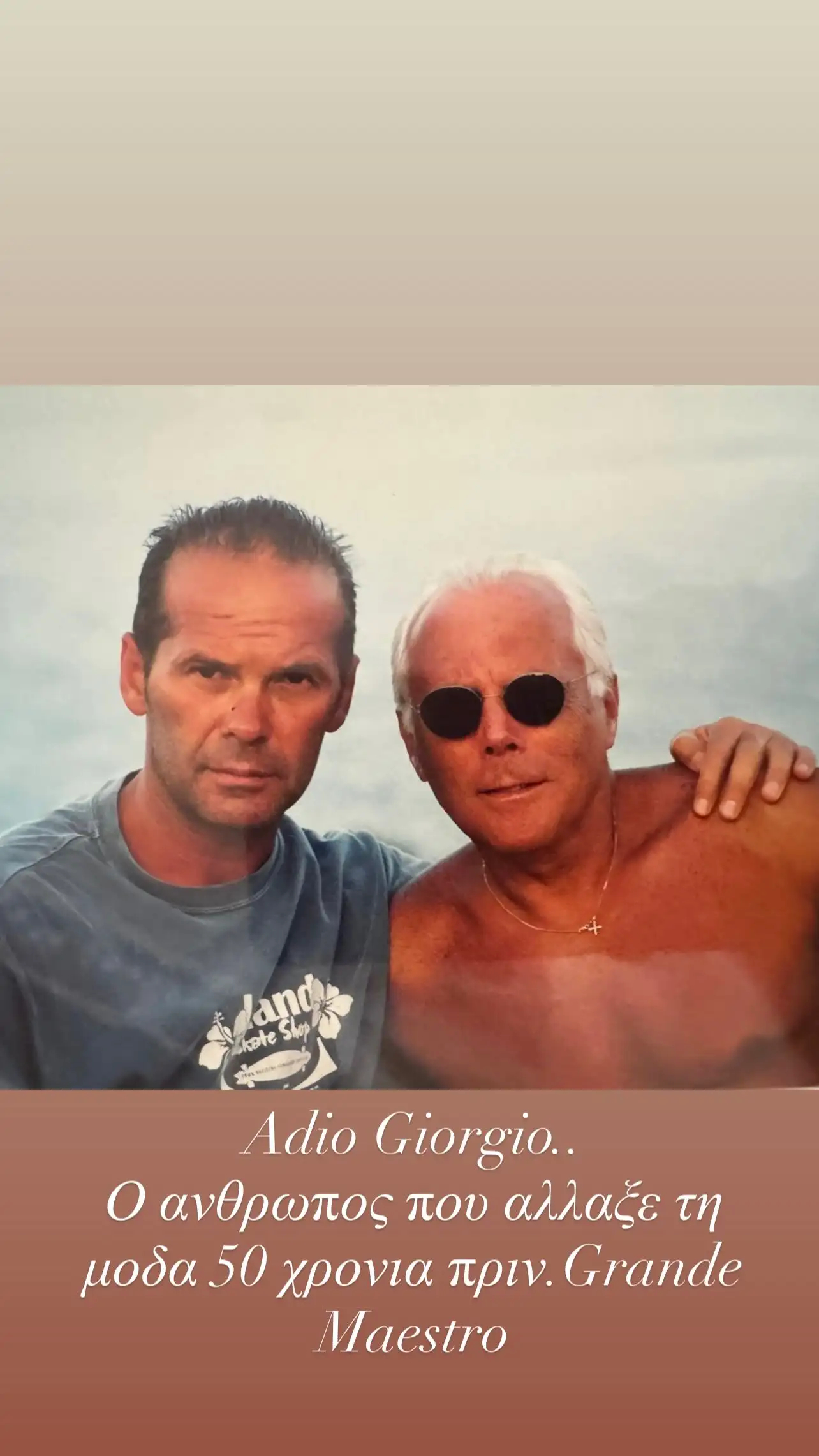 Ο εκδότης ανάρτησε στον προσωπικό του λογαριασμό στο Instagram μια φωτογραφία από το παρελθόν, στην οποία ποζάρει μαζί με τον Αρμάνι. Στη λεζάντα έγραψε: «Adio Giorgio. Ο άνθρωπος που άλλαξε τη μόδα 50 χρόνια πριν. Grande Maestro».