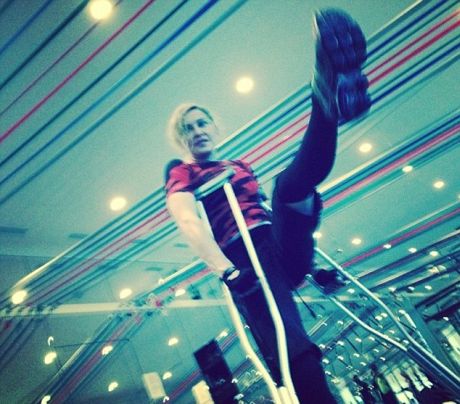 “Inventing a new workout on crutches! Walking up new Neuro transmitters is always fun” έγραφε η λεζάντα που συνόδευε την φωτογραφία, δηλαδή “Εφευρίσκοντας έναν νέο τρόπο προπόνησης με πατερίτσες”.