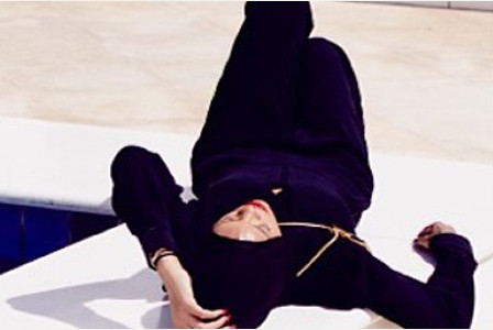 Φορούσε μια κατάμαυρη άνετη φόρμα και μαντήλα στα μαλλιά. Μοναδικές παραφωνίες στη σεμνή της αμφίεση ήταν το κατακόκκινο κραγιόν και τα έντονα νύχια.