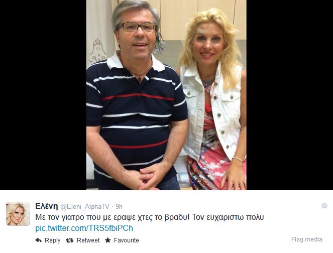 Η παρουσιάστρια αμέσως μεταφέρθηκε στο νοσοκομείο, όπου έκανε ράμματα, ενώ δεν δίστασε να βγάλει και μια φωτογραφία με τον γιατρό που την «έραψε», τον οποίο, μάλιστα, ευχαρίστησε δημόσια και μέσω Twitter.
