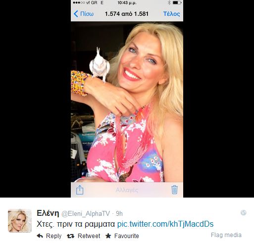 Τι συνέβη στην παρουσιάστρια του Alpha; Η ωραία Ελένη, το απόγευμα της Παρασκευής, είχε πάει σ’ ένα pet shop όπου σαν μικρό παιδί έπαιζε και φωτογραφιζόταν με ένα παπαγαλάκι που εντόπισε, το οποίο όμως ήταν.. άτακτο και την τσίμπησε στο μέτωπο.