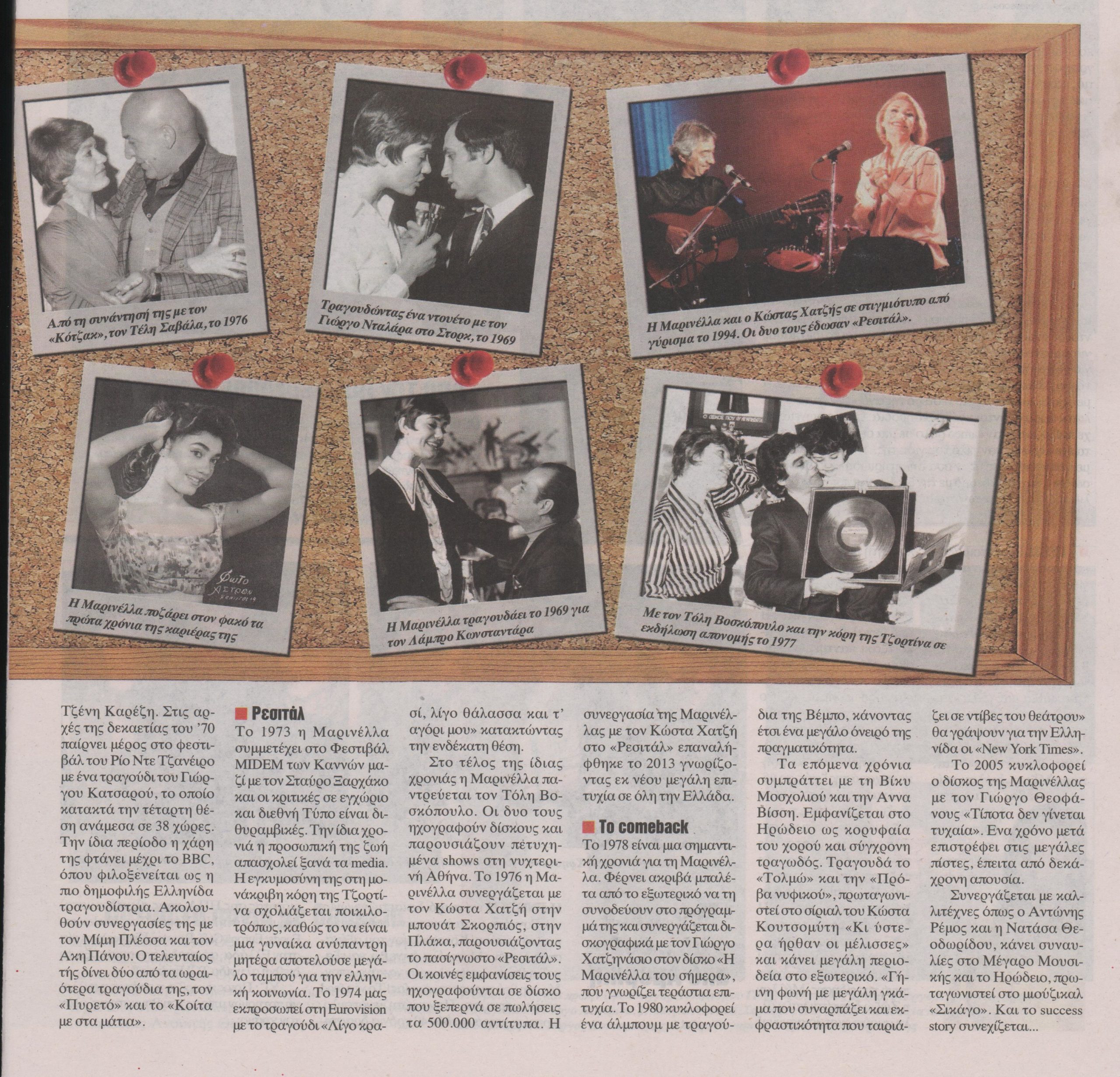 Ωστόσο, τα συναισθήματα απ’ αυτή τη συνάντηση παραμένουν πολύ έντονα στη μνήμη της Μαρινέλλας, σαν να συνέβη μόλις χθες. Η γυναίκα που, όπως είπε κάποτε ο Φρανκ Σινάτρα, θα μπορούσε -αν ήθελε- να είχε κάνει διεθνή καριέρα μέσα σε δύο εβδομάδες, συμπληρώνει φέτος 58 χρόνια λαμπρής πορείας στο καλλιτεχνικό στερέωμα.