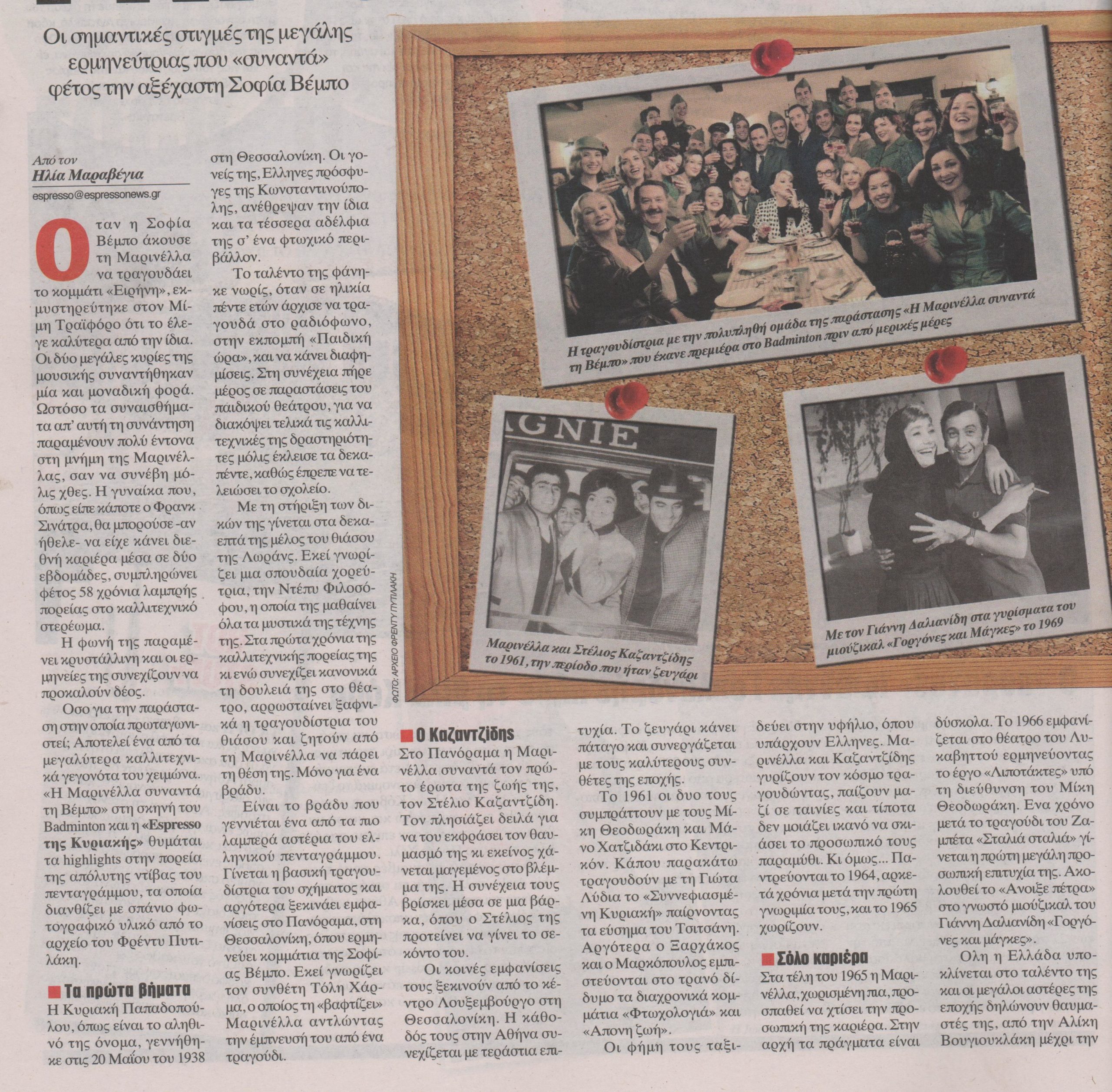 Όσο για την παράσταση στην οποία πρωταγωνιστεί; Αποτελεί ένα από τα μεγαλύτερα καλλιτεχνικά γεγονότα του χειμώνα. «Η Μαρινέλλα συναντά τη Βέμπο» στη σκηνή του Badminton και η «Espresso της Κυριακής» θυμάται τα highlights στην πορεία της απόλυτης ντίβας του πενταγράμμου, τα οποία διανθίζει με σπάνιο φωτογραφικό υλικό από το αρχείο του Φρέντυ Πυτιλάκη.