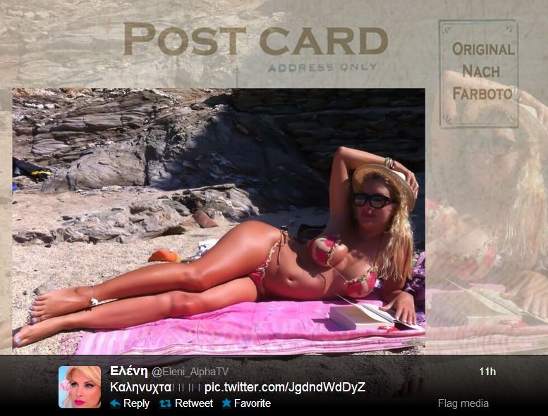 Τις διακοπές της στην Άνδρο συνεχίζει η Ελένη Μενεγάκη η οποία εξακολουθεί να εκπλήσσει ευχάριστα τους θαυμαστές της στο twitter.