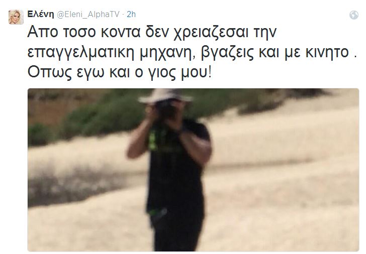 Η ίδια ανέβασε φωτογραφίες με τον παπαράτσι στο twitter κι έγραψε: “Έτσι βγάζει το … ψωμί του ο Μ.Μ ! Έρχεται στα 3 μέτρα και σε βγάζει φωτό!!! Μέσα στα μούτρα σου!”