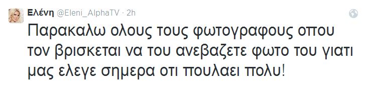 Στη συνέχεια η Ελένη Μενεγάκη μη μπορώντας να κρύψει τον εκνευρισμό της έγραψε: “Παρακαλώ όλους τους φωτογράφους όπου τον βρίσκετε να του ανεβάζετε φωτό του γιατί μας έλεγε σήμερα οτι πουλάει πολύ”.