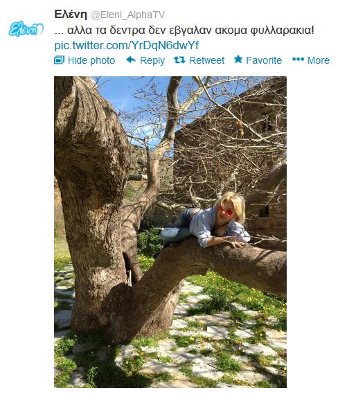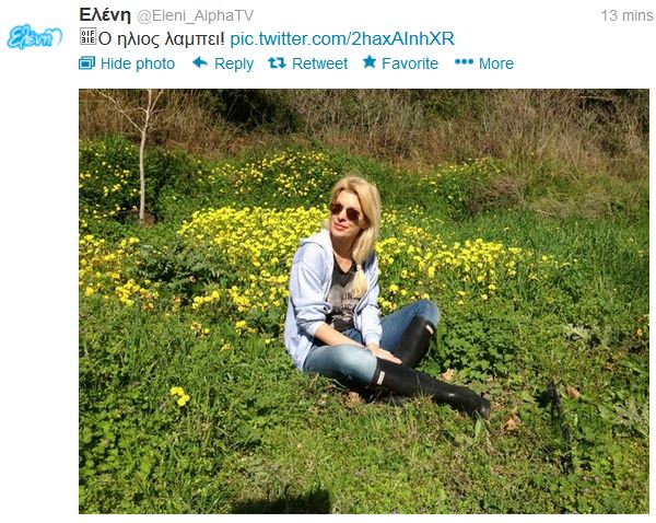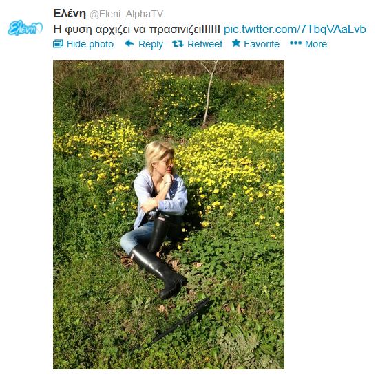 Ο ήλιος λάμπει σήμερα στον Αττικό ουρανό και η Ελένη Μενεγάκη βρήκε την ευκαιρία να κάνει μία βόλτα στη φύση. Δείτε τις φωτογραφίες που ανέβασε στο twitter.