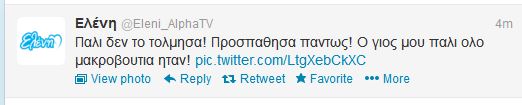 Η παρουσιάστρια του Alpha σχολίασε: “Πάλι δεν το τόλμησα! Προσπάθησα πάντως! Ο γιος μου πάλι όλο μακροβούτια ήταν!”.