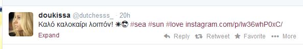 “Καλό καλοκαίρι λοιπόν!” έγραψε η Δούκισσα Νομικού στο twitter και ανεβασε μία φωτογραφία της στο instagram που κάνει ηλιοθεραπεία στην θάλασσα.