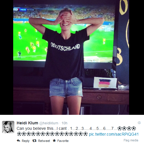 Το γνωστό μοντέλο Χάιντι Κλουμ πανηγύρισε μέσω twitter για την νίκη της Γερμανίας έναντι της Βραζιλίας στον ημιτελικό του Μουντιάλ.