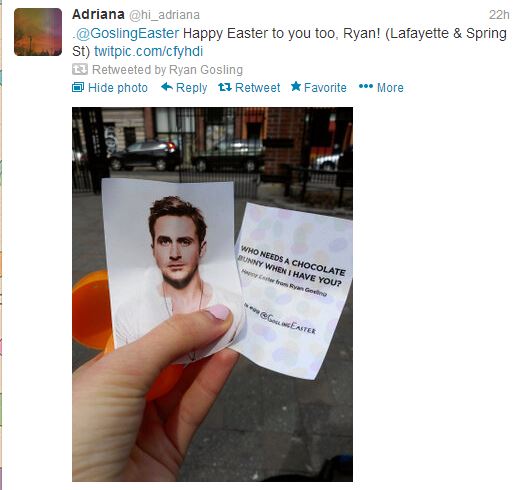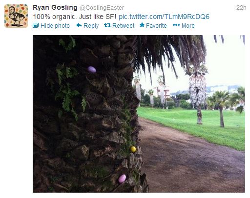 To account @GoslingEaster για να βοηθήσει τους χρήστες του twitter να ανακαλύψουν τα πασχαλινά αυγά, ανεβάζει φωτογραφίες από πιθανά μέρη και τους ωθεί να ψάξουν εκεί.
