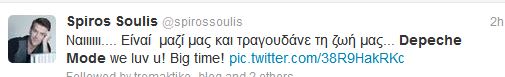 Ο ενθουσιασμός δεν κρύβεται! «Ναιιιιιι…. Είναί μαζί μας και τραγουδάνε τη ζωή μας… Depeche Mode we luv u! Big time!», έγραψε νωρίτερα στο Twitter ο Σπύρος Σούλης από το Terra Vibe όπου βρίσκεται, παρακολουθώντας τη συναυλία των Depeche Mode.