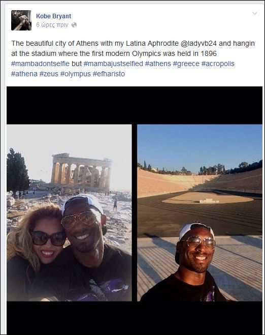 Ο Κόμπι Μπράιαντ συνεχίζει τις διακοπές του στην Ελλάδα και με τις φωτογραφίες που ανεβάζει στα social media διαφημίζει με τον καλύτερο τρόπο τη χώρα μας. Ο σούπερ σταρ των Λος Άντζελες Λέικερς επισκέφθηκε με τη γυναίκα του την Ακρόπολη και το Καλλιμάρμαρο και όπως φαίνεται από το σχόλιό του είναι εντυπωσιασμένος από την Αθήνα.