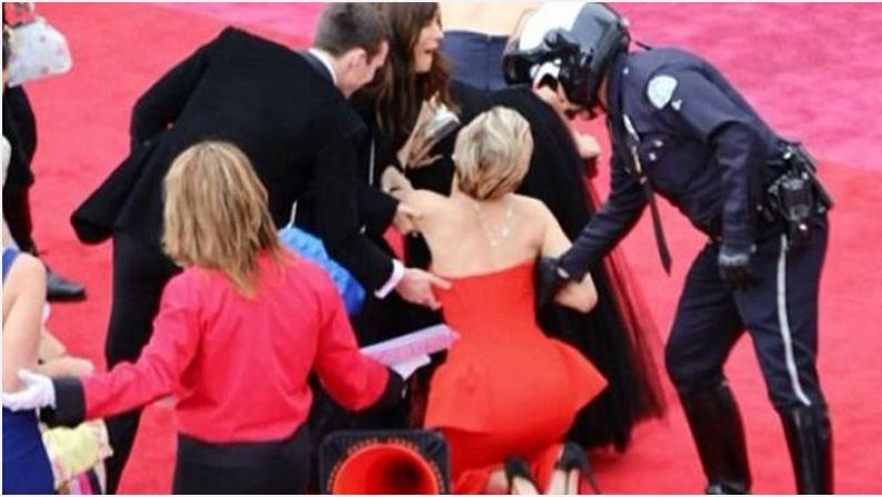 Φορώντας μία εντυπωσιακή τουαλέτα, η ηθοποιός παραπάτησε και έπεσε στο κόκκινο χαλί. Η αντίδρασή της ήταν να την πιάσει νευρικό γέλιο.