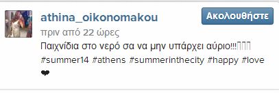 Η γνωστή ηθοποιός απολαμβάνει τις βουτιές της στην Αθήνα και μοιράζεται κάποιες από τις όμορφες στιγμές της με τους διαδικτυακούς της φίλους… Ο λόγος για την Αθηνά Οικονομάκου η οποία ανέβασε την φωτογραφία της στο Instagram γράφοντας “Παιχνίδια στο νερό σα να μην υπάρχει αύριο!”