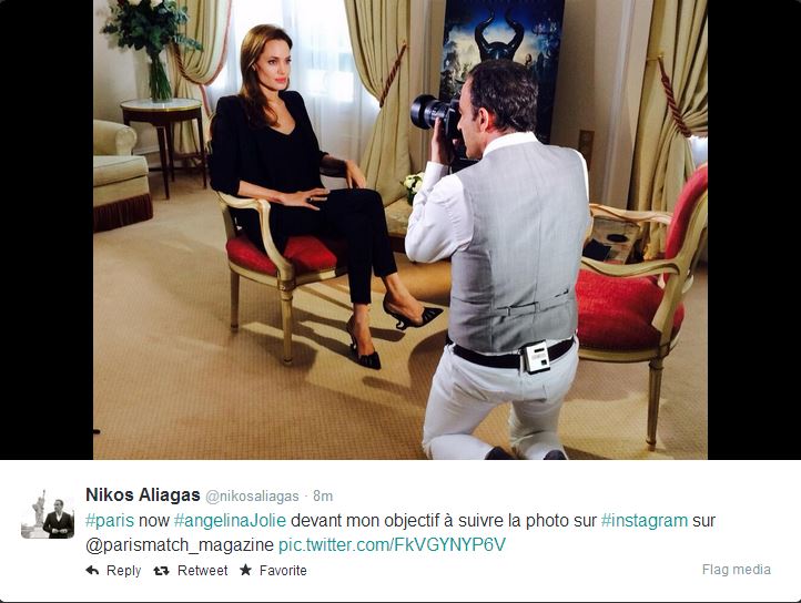 Ο Νίκος Αλιάγας έγραψε στο Twitter, «Παρίσι, τώρα. Η Αντζελίνα Τζολί μπροστά από τη φωτογραφική μου μηχανή για να τραβήξω φωτογραφία για το περιοδικό ParisMatch».
