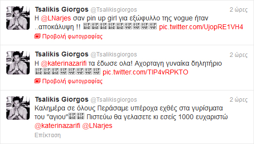 O Γιώργος Τσαλίκης ανέβασε στο twitter φωτογραφίες από τα γυρίσματα του νέου βιντεοκλίπ του τραγουδιού “Άγιος” και σχολίασε: “Καλημέρα σε όλους. Περάσαμε υπέροχα χθες στα γυρίσματα του “Αγιου”. Πιστεύω θα γελάσετε κι εσείς 1000 ευχαριστώ. Η Κατερίνα Ζαρίφη τα έδωσε όλα! Αχόρταγη γυναίκα δηλητήριο. Η Λάουρα Νάργες σαν pin up girl για εξώφυλλο της Vogue ήταν”.