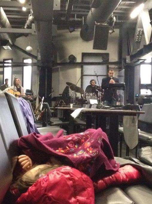 Η Κατερίνα Καραβάτου ανέβασε στον λογαριασμό της στο facebook μία φωτογραφία που απεικονίζει την κόρη της, Αέλια να κοιμάται κατά τη διάρκεια πρόβας του μπαμπά της, Κρατερού Κατσούλη.