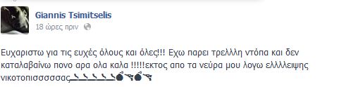 «Ευχαριστώ για τις ευχές όλους και όλες!!! Έχω πάρει τρελή ντόπα και δεν καταλαβαίνω πόνο άρα όλα καλά !!!!!εκτός από τα νεύρα μου λόγω έλλειψης νικοτοπίσσας», έγραψε ο Γιάννης Τσιμιτσέλης, ο οποίος παράλληλα ανέβασε άλλη μια φωτογραφία που τον δείχνει «στο κρεβάτι του πόνου».