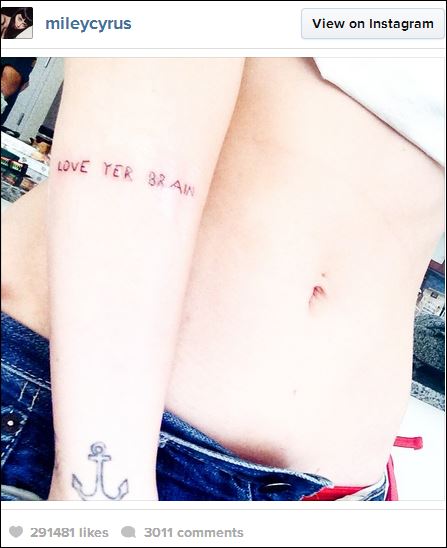 Η εκκεντρική τραγουδίστρια έγραψε στο χέρι της τη φράση «Love Yer Brain», που είναι ο τίτλος ενός τραγουδιού των Flaming Lips. Αμέσως μετά ανέβασε τη φωτογραφία στον λογαριασμό της στο Instagram.