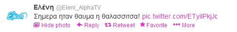 Η Ελένη Μενεγάκη “πλημμυρίζει” το twitter της με Άνδρο και θάλασσα. Πριν από λίγο ανέβασε μια φωτογραφία της με το “θαύμα”, που δεν είναι άλλο απο τη θάλασσα…