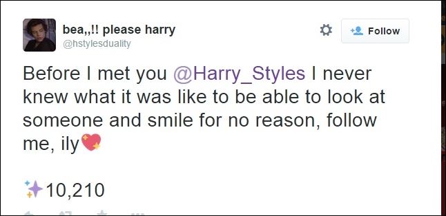 «Πριν σε γνωρίσω Harry Styles δεν ήξερα πως είναι να κοιτάς κάποιον και να χαμογελάς χωρίς λόγο. Σε παρακαλώ, κάνε με follow, Ily».