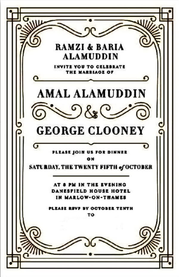 Τη δεξίωση διοργάνωσαν οι γονείς της Αμάλ Αλαμουντίν ενώ όπως φαίνεται και στην πρόσκληση, οι καλεσμένοι είχαν προθεσμία να απαντήσουν αν θα παρευρεθούν μέχρι τις 10 Οκτωβρίου.