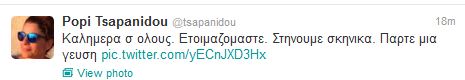 “Καλημέρα σε όλους. Ετοιμαζόμαστε. Στήνουμε σκηνικά. Πάρτε μια γεύση” σχολίασε στο twitter η Πόπη Τσαπανίδου ανεβάζοντας την ακόλουθη φωτογραφία.