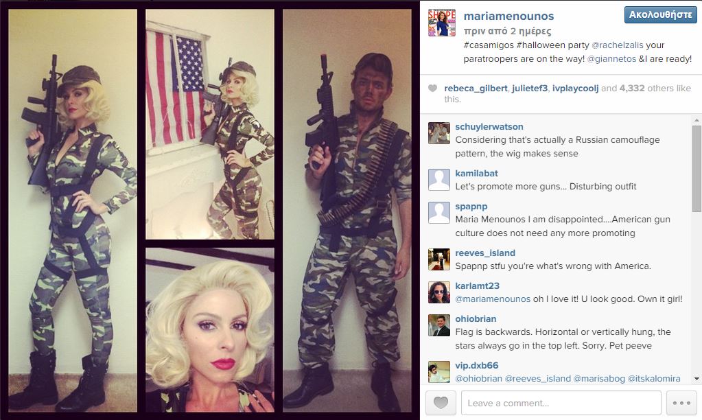 Οι δυο συνεργάτες και πολύ καλοί φίλοι, αποφάσισαν να ντυθούν στρατιώτες για να πάνε σε κάποιο party μεταμφιεσμένων. H ελληνικής καταγωγής παρουσιάστρια ανάρτησε κάποια χαριτωμένα στιγμιότυπα τους στο Instagram, απ΄όπου και απέσπασε το like των διαδικτυακών της φίλων.