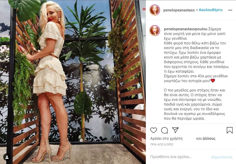 Γενέθλια έχει η Πηνελόπη Αναστασοπούλου, με την ηθοποιό να συμπληρώνει τα 43α της χρόνια. Η ίδια σε ανάρτησή της στον λογαριασμό της στο instagram σημειώνει ότι “σήμερα είναι γιορτή για μενα όχι μόνο γιατί έχω γενέθλια. Κάθε φορά που θέλω κάτι βάζω τον εαυτό μου στη διαδικασία να το πετύχω. Έχω λοιπόν ένα όμορφο κουτί και μέσα βάζω χαρτάκια με διάφορους στόχους. Κάθε γενέθλια που έρχονται το ανοίγω και τσεκάρω τι έχω καταφέρει.Σήμερα λοιπόν στα 43α μου γενέθλια γιορτάζω την ευτυχία μου!” γράφει η ηθοποιός και προσθέτει: “Ο πιο μεγάλος μου στόχος ήταν και θα είναι αυτός. Ο στόχος ήταν να έχω έναν σύντροφο να με νοιώθει, παιδιά υγιή και χαρούμενα, σώμα υγιές και ενεργό, νου το ίδιο και δουλειά να αγαπώ με συναδέλφους που θα περνάμε ωραία. Σήμερα τα έχω όλα. Γιορτάζω! Είμαι πλήρης, χαρούμενη και έτοιμη για άλλα καινούρια και μεγάλα! Σας ευχαριστώ και ανταποδίδω τις ευχές σε όσους μου έχετε ήδη ευχηθεί και σε όσους θα μου ευχηθείτε κάτω από αυτό το ποστ! Σας αγαπώ!”