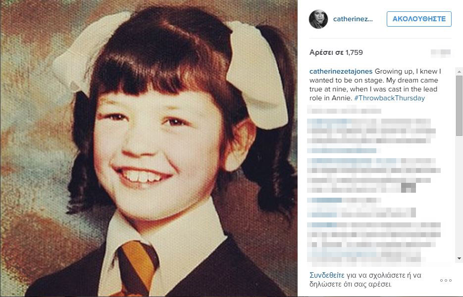 Η 45χρονη ηθοποιός, Κάθριν Ζέτα Τζόουνς, που είναι παντρεμένη με έναν από τους διασημότερους άνδρες του Αμερικανικού κινηματογράφου, τον Μάικλ Ντάγκλας, ανέβασε τη συγκεκριμένη φωτογραφία στον προσωπικό της λογαριασμό στο Instagram, σχολιάζοντας: «Μεγαλώνοντας ήξερα ότι ήθελα να είμαι επάνω σε μία σκηνή. Το όνειρό μου πραγματοποιήθηκε όταν στην ηλικία των 9 ετών, κατείχα τον πρωταγωνιστικό ρόλο στο θεατρικό έργο Annie!».