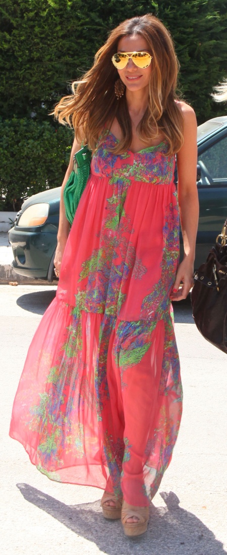 Αυτό το πολύχρωμο hippy-chic μάξι καλοκαιρινό φόρεμα, έχει την υπογραφή του οίκου Halston. Καθεμιά από τις δύο κυρίες, που έχει το δικό της στιλ, το φόρεσε με τον δικό της τρόπο- εσάς ποια σας άρεσε καλύτερα ;
