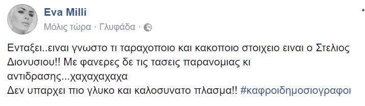 Ξέσπασε με ανάρτησή της στο Facebook για την υπόθεση του Στέλιου Διονυσίου η τραγουδίστρια Εύα Μιλλή.
