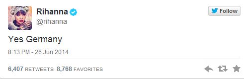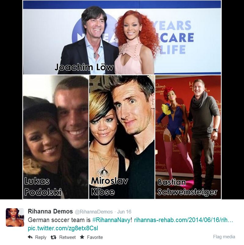 Η ποπ-σταρ με καταγωγή από τα Μπαρμπέιντος, μπορεί να χαίρει της εκτίμησης εκατομμυρίων Αμερικανών για τη μουσική αλλά και τα… κάλλη της, ωστόσο στο μουντιάλ της Βραζιλίας, το οποίο παρακολουθεί ανελλιπώς και με μανία, στηρίζει Γερμανία.