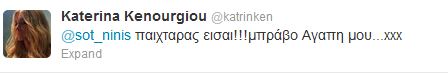 Μετά το νικητήριο παιχνίδι της Εθνικής μας η Κατερίνα Καινούργιου, έστειλε το δικό της μήνυμα στο Σωτήρη Νίνη.Έγραψε στο twitter: