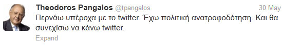 H δήλωση του Θεόδωρου Πάγκαλου στο twitter έκανε το γύρο των media και προκάλεσε αντιδράσεις – μεταξύ αυτών που απάντησαν ήταν και η Άντζυ Σαμίου.Ο κ. Πάγκαλος έγραψε: